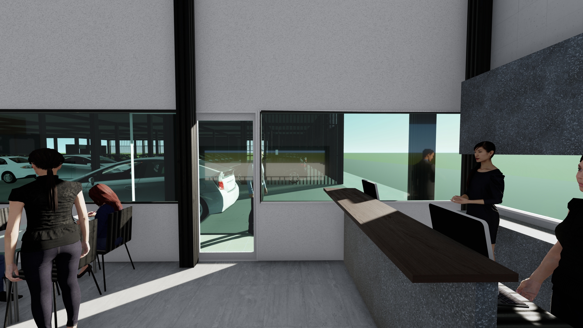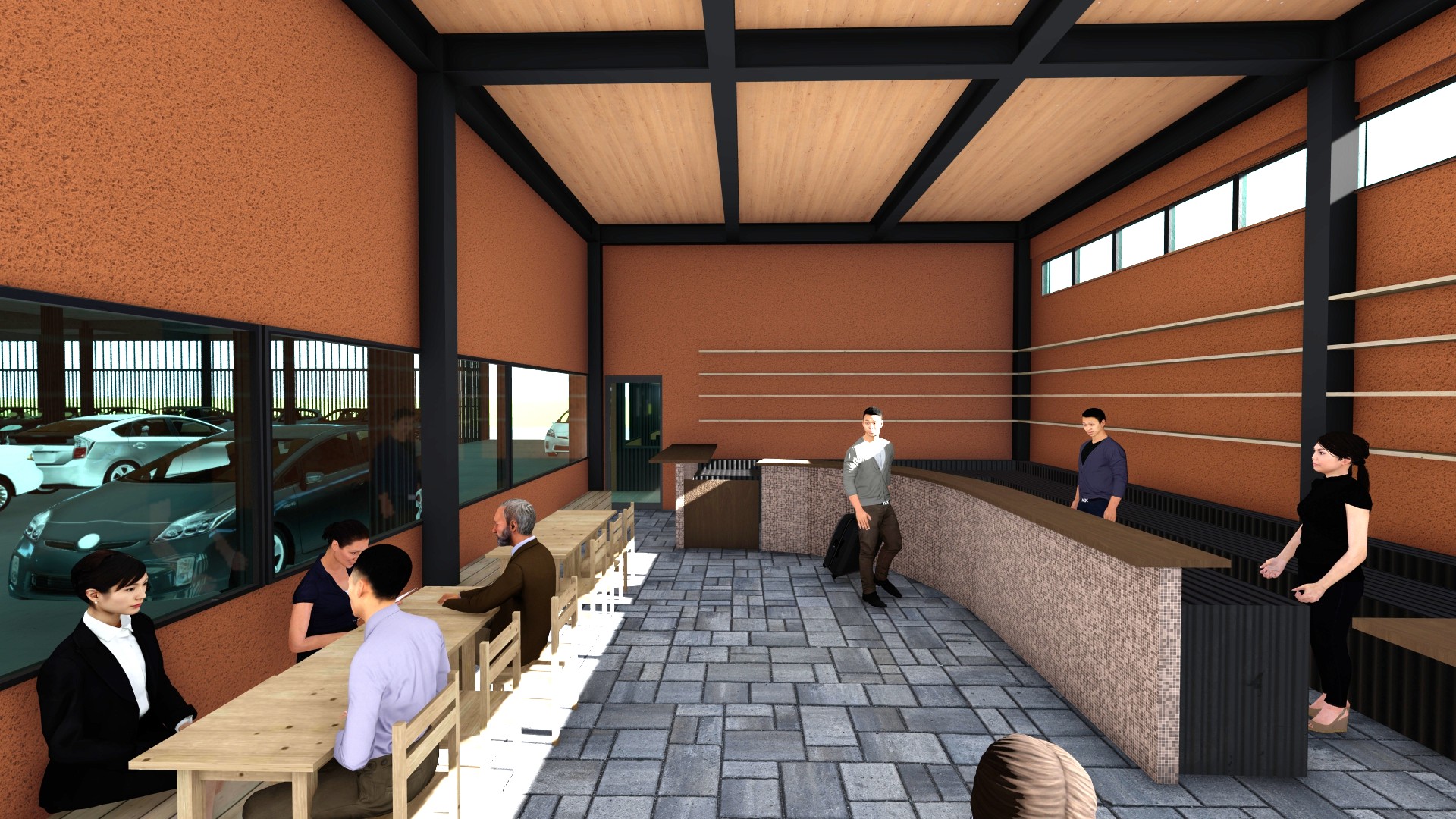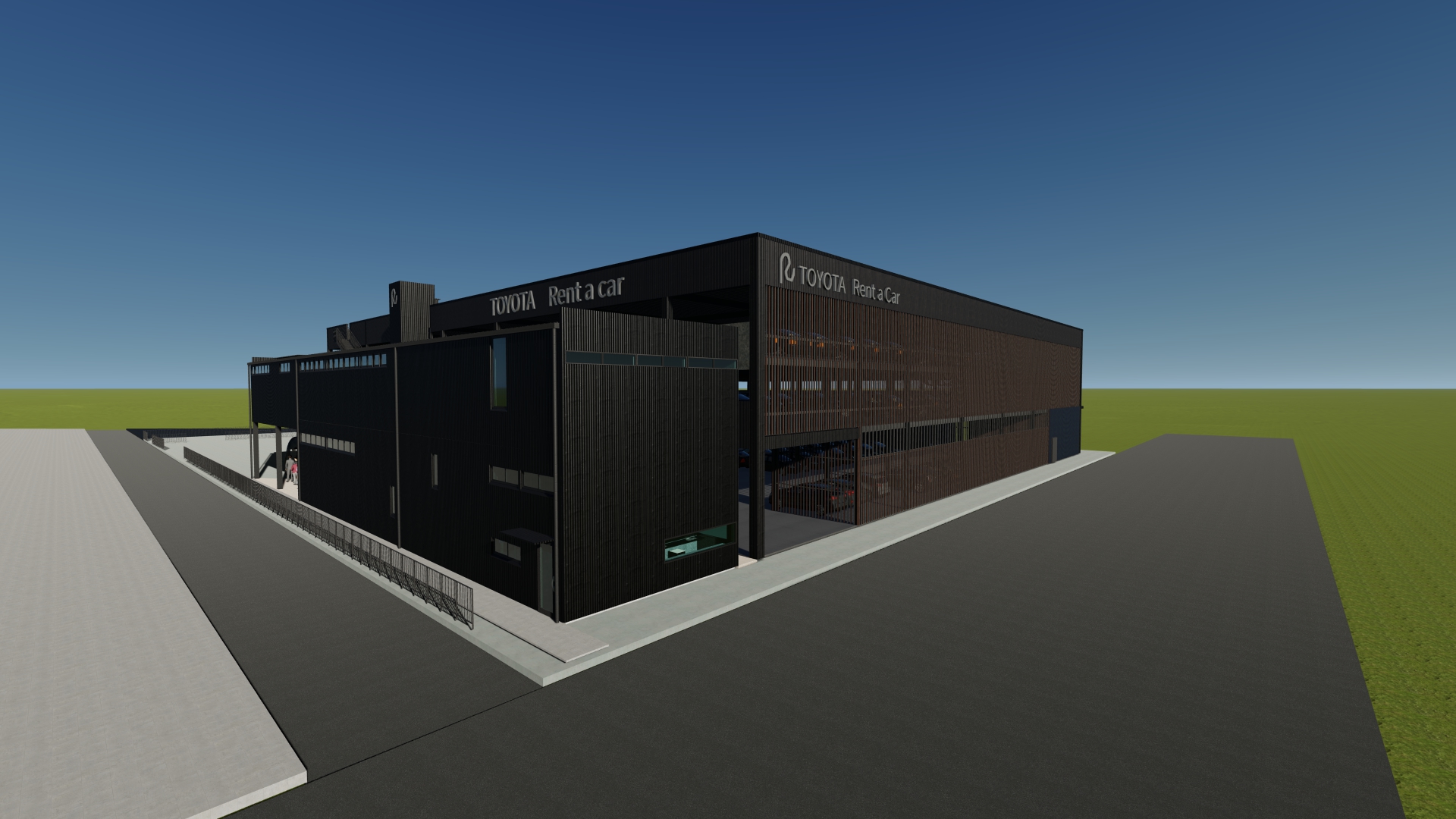 3階建ての立体駐車場(8070㎡)と駐車場を管理する事務所建築(496㎡)の計画。立体駐車場は1フロアおよそ100台を収容し、屋上階を含め4層の駐車場の計画。1Fは空港へ行き来するマイクロバスが通過するため階高を4.65mとしている。レンタカーの車両の返却→洗車→建物内へ保管といった一連の流れがシームレスに完結するように1F~R階までの動線計画を行っている。事務所棟には受付・待合スペースの他に、飲食スペースを併設し、利用者の車の返却後、飛行機の時間まで店内で時間を過ごすことができる計画としている。2Fは大会議室、小会議室が併設されており、大小の会議に適した空間としている。内部は床と天井に愛媛県産材のCLT材(180㎜、120㎜)を使用し、鉄骨造と木質構造を組み合わせたハイブリッドなデザインが特徴となっている。立体駐車場のファサードは日本の伝統的な町家の格子を彷彿させるジャパニーズモダンなデザインとしつつ、格子の間隔は駐車場法の求められる法的な開放性を各階で担保した計画としている。車路のスロープ、通路幅は行き違いができる、ゆとりのある寸法(5.5m)とし、スムーズな車両の管理を目指した計画としている。2026年夏頃完成予定。
