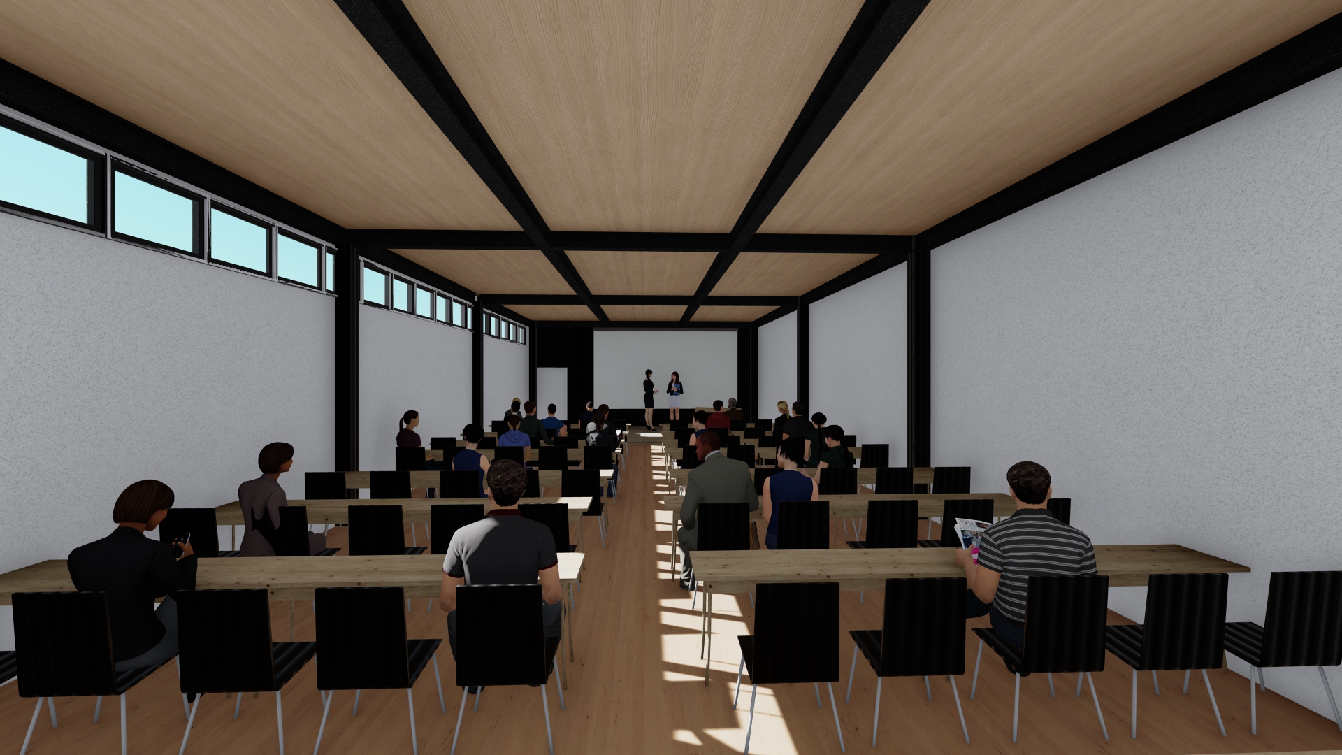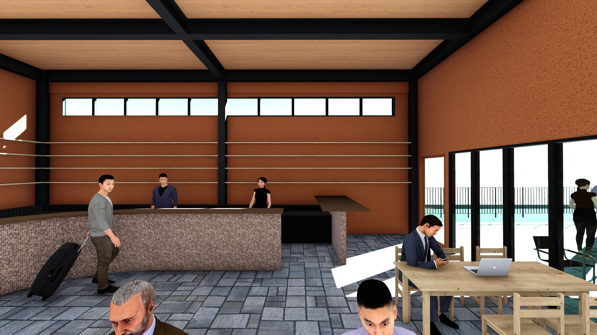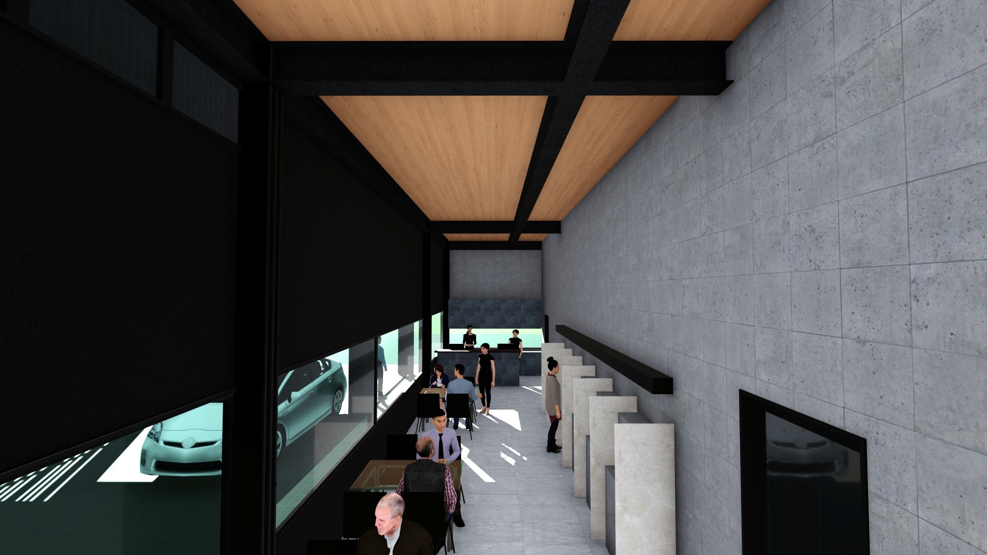 3階建ての立体駐車場(8070㎡)と駐車場を管理する事務所建築(496㎡)の計画。立体駐車場は1フロアおよそ100台を収容し、屋上階を含め4層の駐車場の計画。1Fは空港へ行き来するマイクロバスが通過するため階高を4.65mとしている。レンタカーの車両の返却→洗車→建物内へ保管といった一連の流れがシームレスに完結するように1F~R階までの動線計画を行っている。事務所棟には受付・待合スペースの他に、飲食スペースを併設し、利用者の車の返却後、飛行機の時間まで店内で時間を過ごすことができる計画としている。2Fは大会議室、小会議室が併設されており、大小の会議に適した空間としている。内部は床と天井に愛媛県産材のCLT材(180㎜、120㎜)を使用し、鉄骨造と木質構造を組み合わせたハイブリッドなデザインが特徴となっている。立体駐車場のファサードは日本の伝統的な町家の格子を彷彿させるジャパニーズモダンなデザインとしつつ、格子の間隔は駐車場法の求められる法的な開放性を各階で担保した計画としている。車路のスロープ、通路幅は行き違いができる、ゆとりのある寸法(5.5m)とし、スムーズな車両の管理を目指した計画としている。2026年夏頃完成予定。